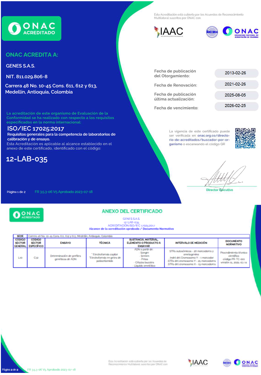 – Acreditación del Organismo Nacional de Acreditación de Colombia con la norma ISO/IEC 17025:2017