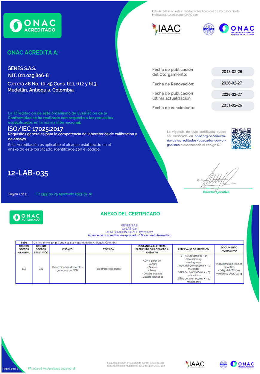 – Acreditación del Organismo Nacional de Acreditación de Colombia con la norma ISO/IEC 17025:2017